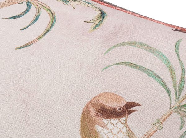 Empoleirado em galhos delicados, um espetáculo edificante de graciosos pássaros impressos em uma sofisticada mistura de linho.